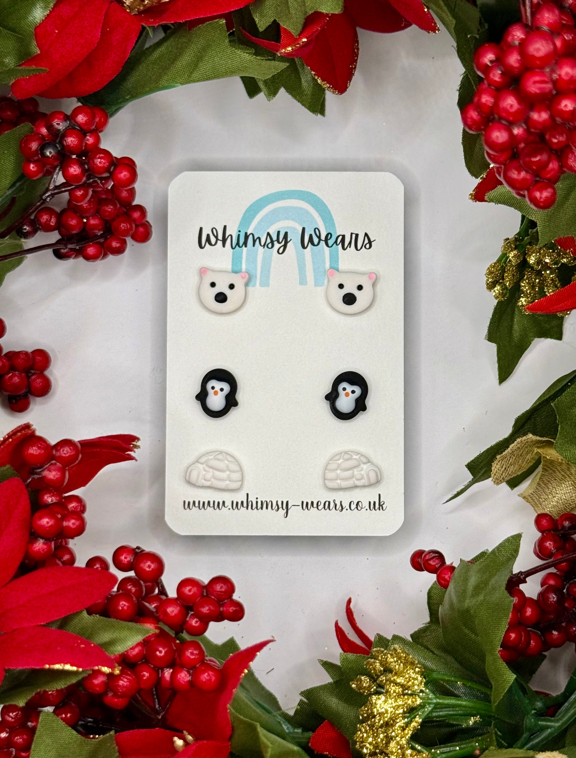 Arctic Stud Pack. Penguin, polar bear and igloo studs with hypoallergenic stud backs.