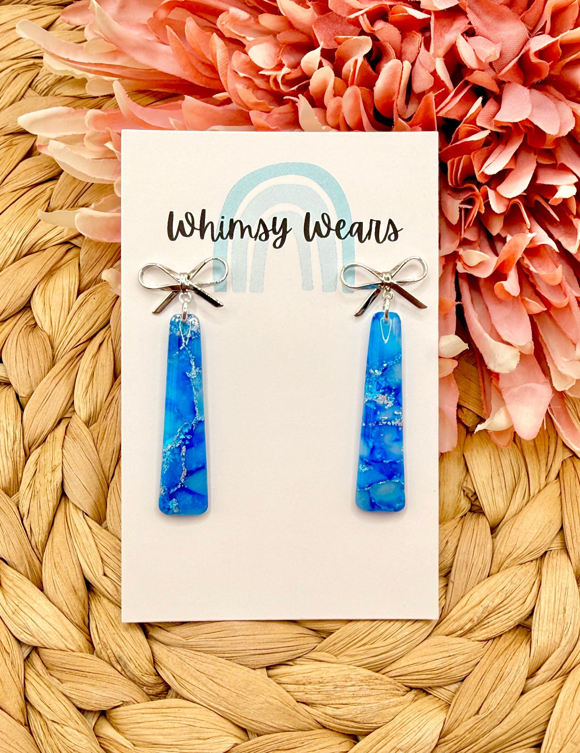 Beautifully Blue marbled long drop earrings with silver flecks and a top coat of glossy resin. Finished with a silver coloured bow stud.