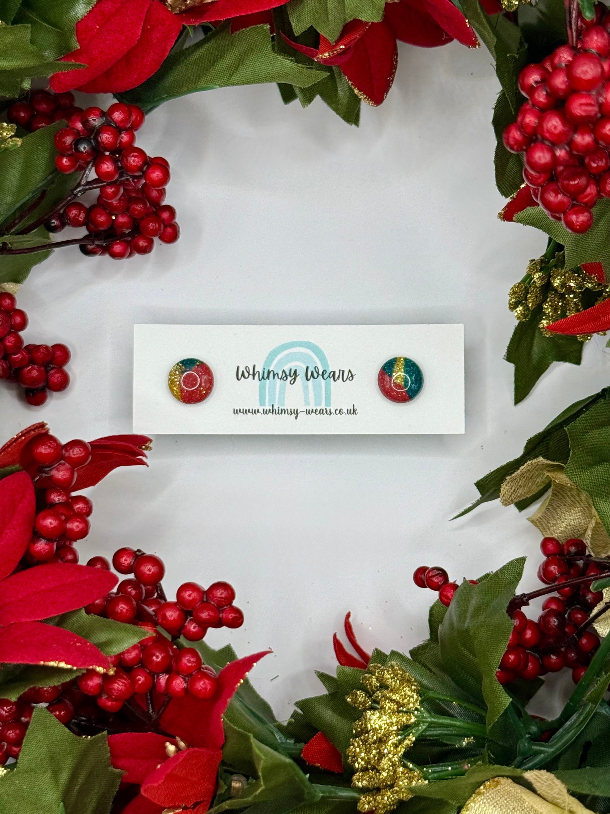 Red, Green and gold glittery Christmas studs with hypoallergenic stud back.