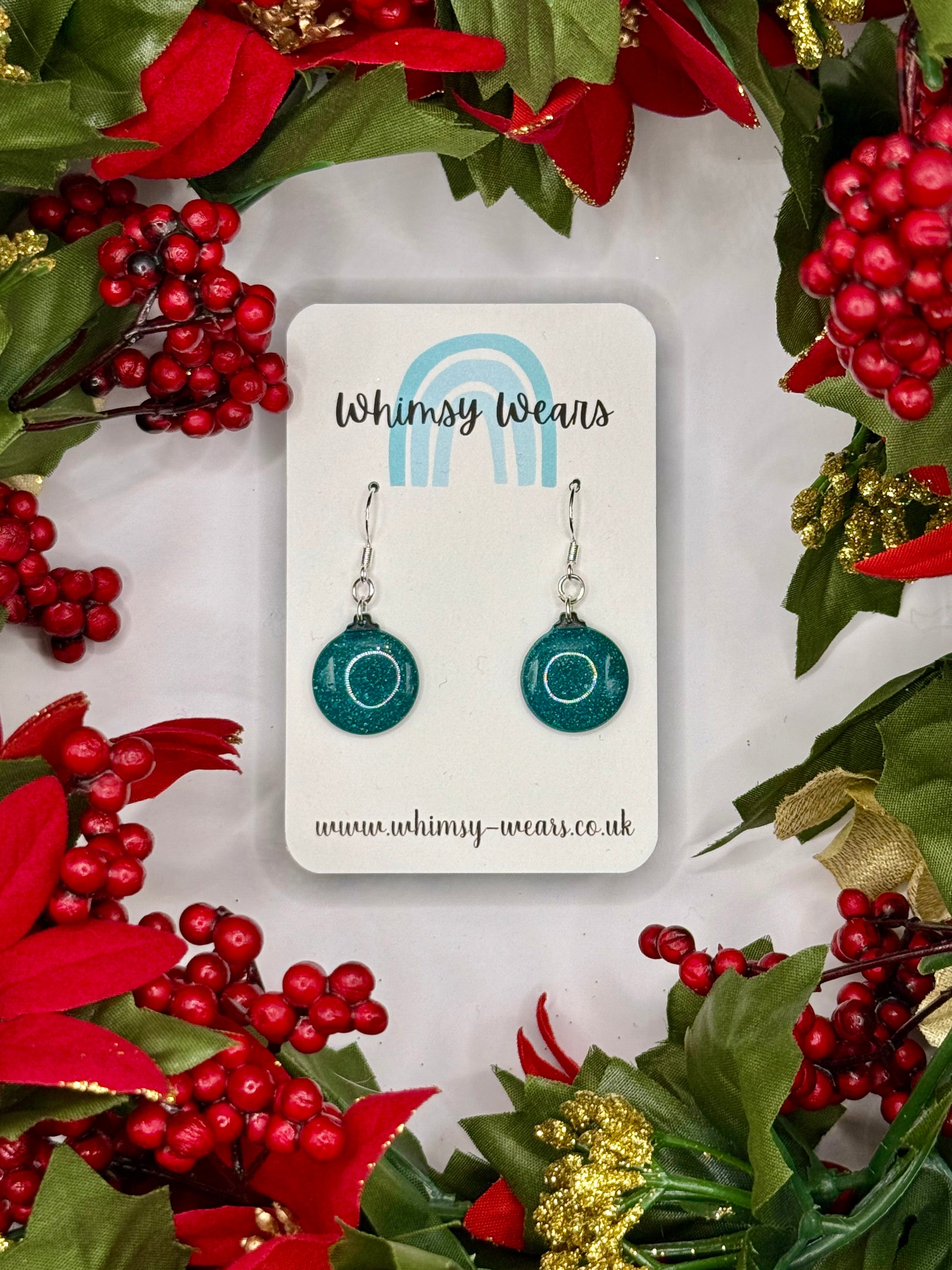 Glittery green baubles with either a gold or silver coloured hook earring.