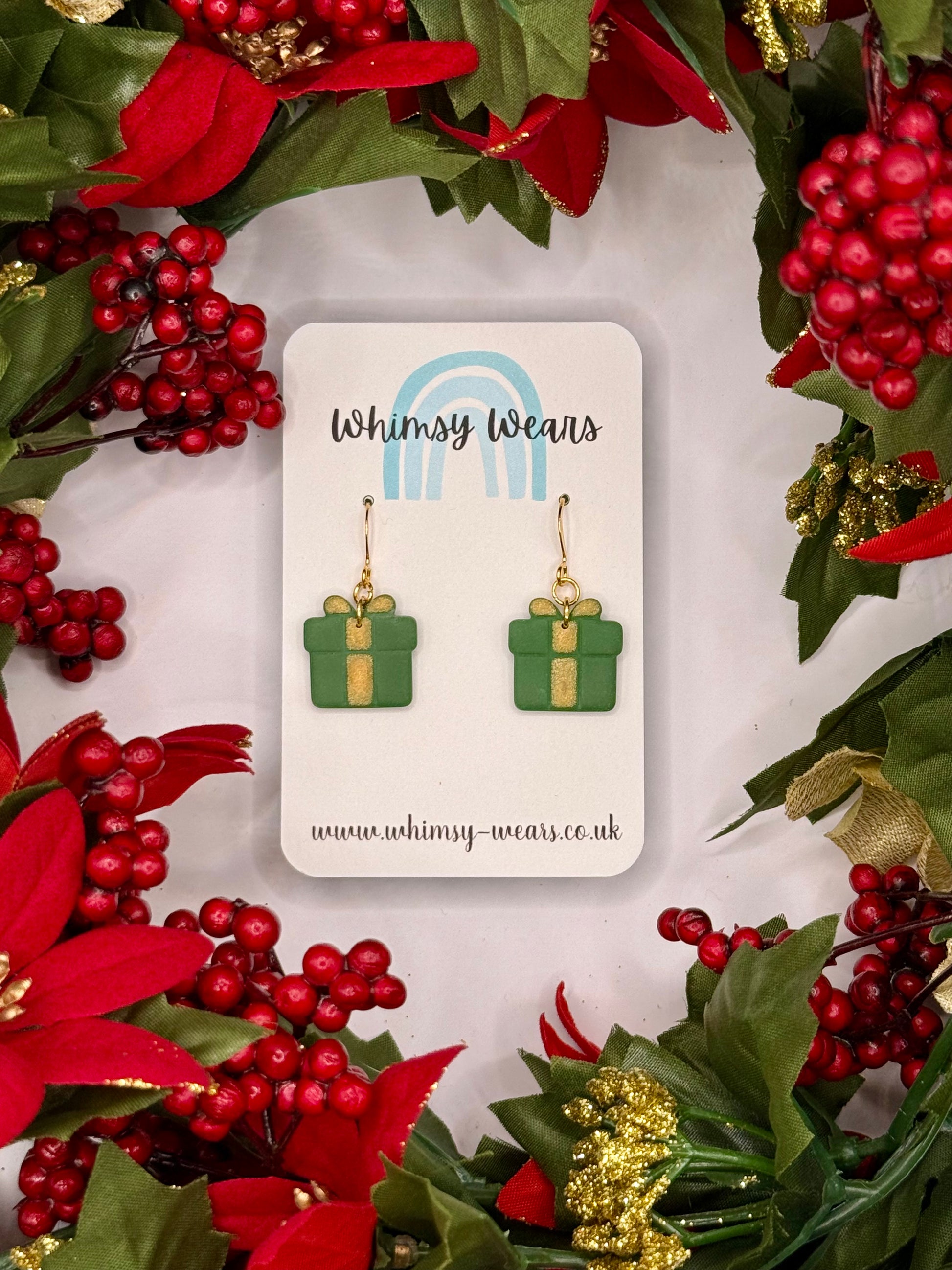 Green presents with gold ribbon and gold coloured hook earrings.