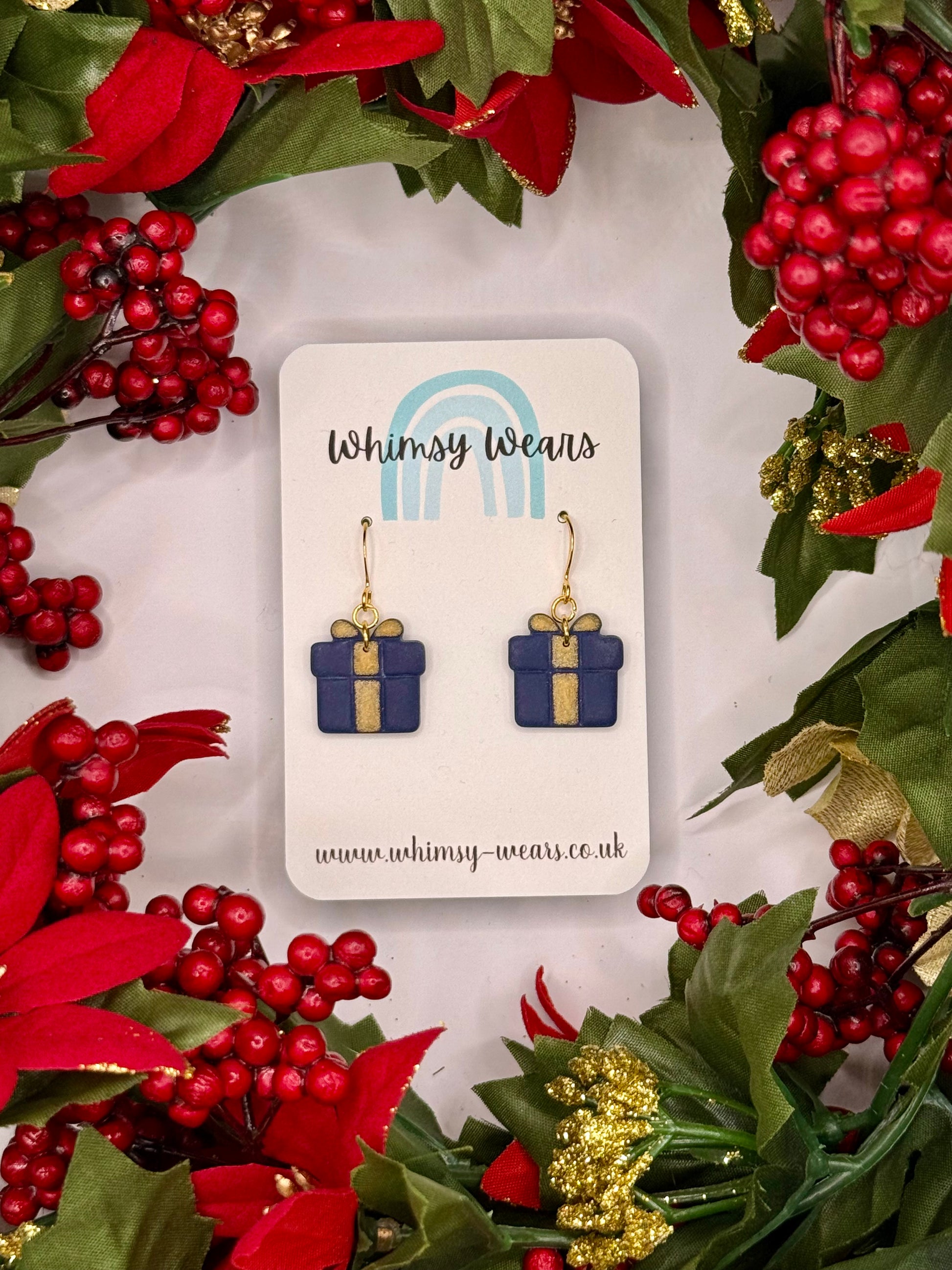 Navy presents with gold ribbon and gold coloured hook earrings.