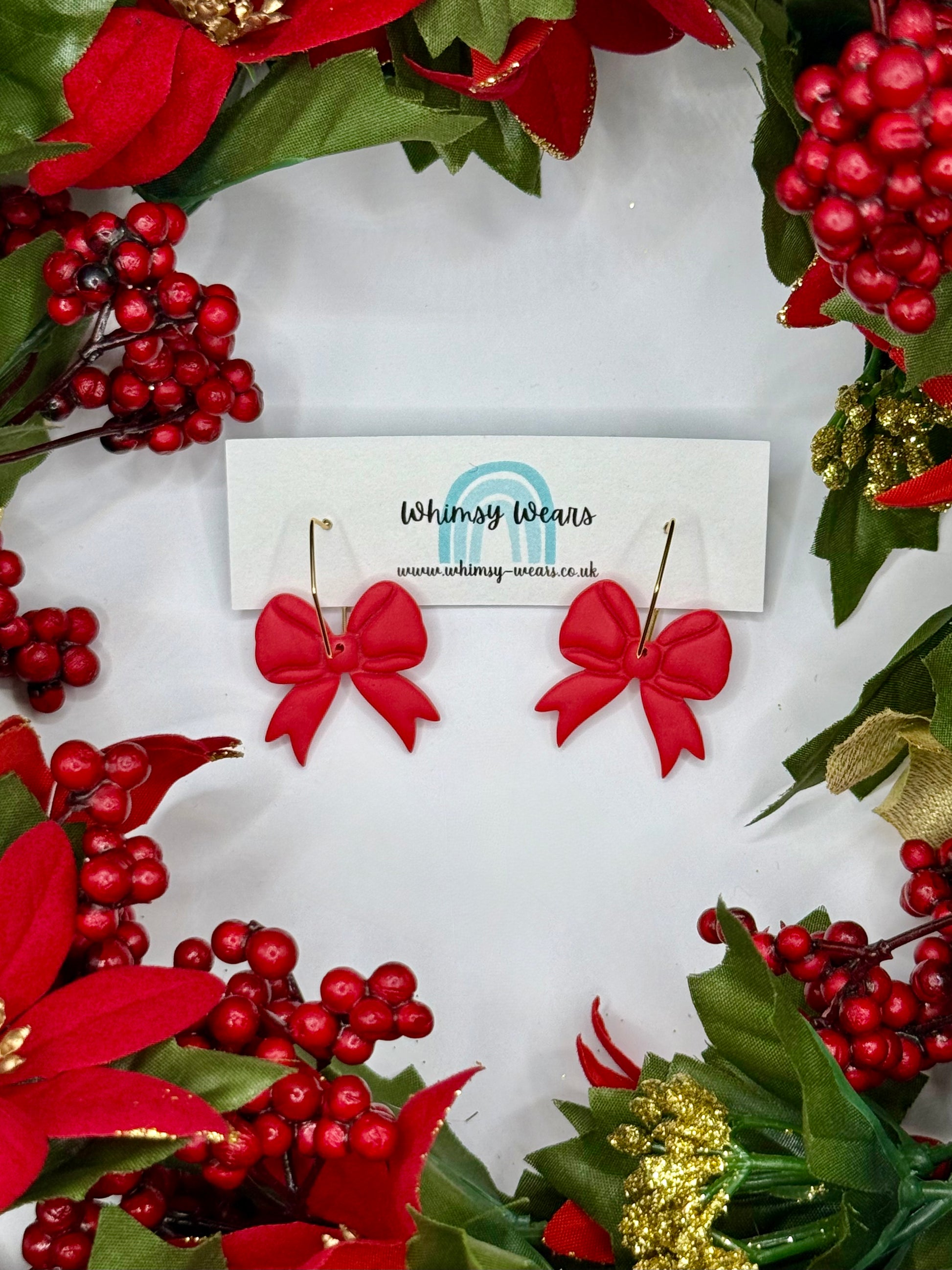 Red ribbon earrings on a gold coloured hexagon hoop.