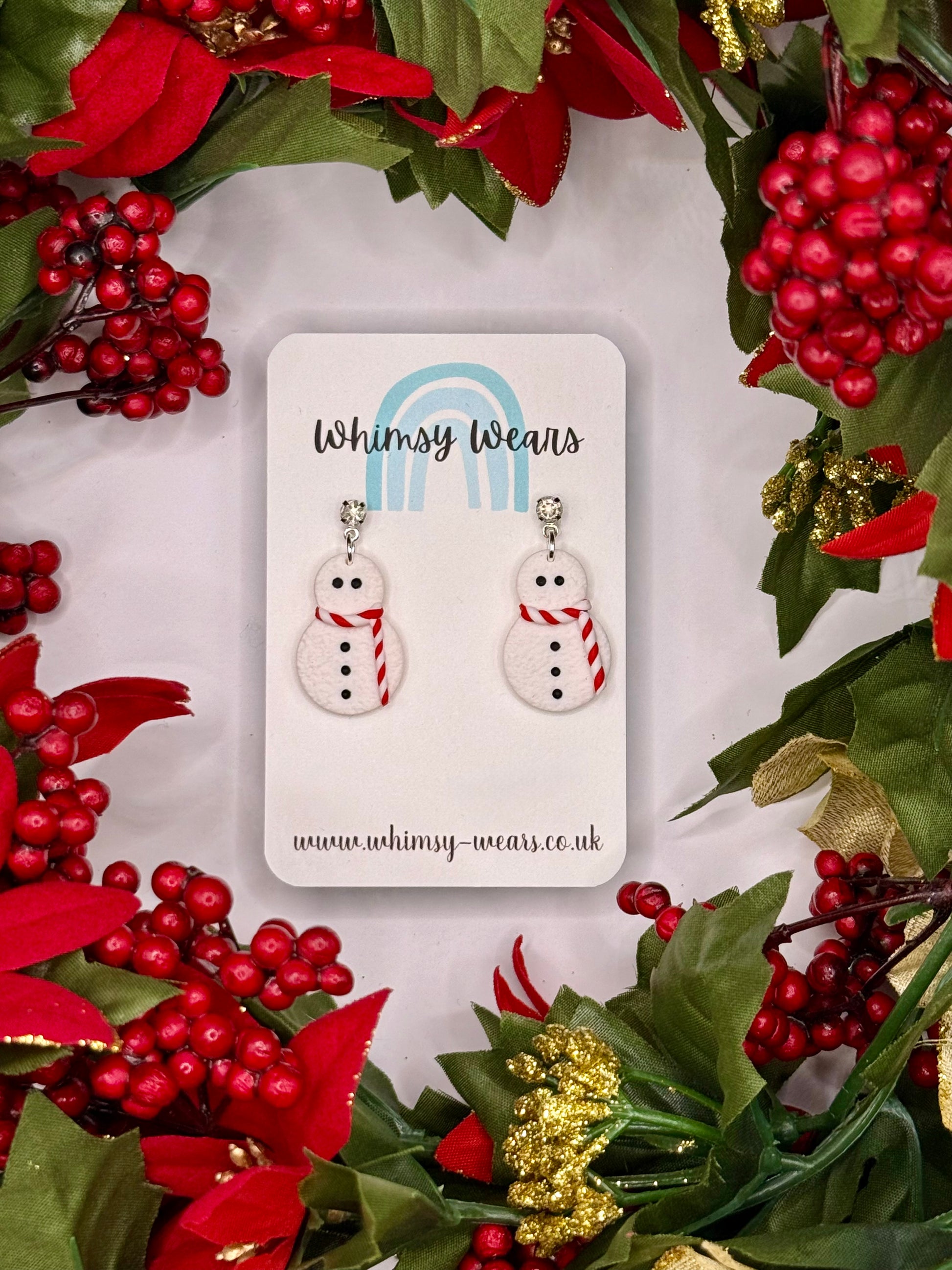 Snowman drop earrings with either a silver or gold coloured gem stud.