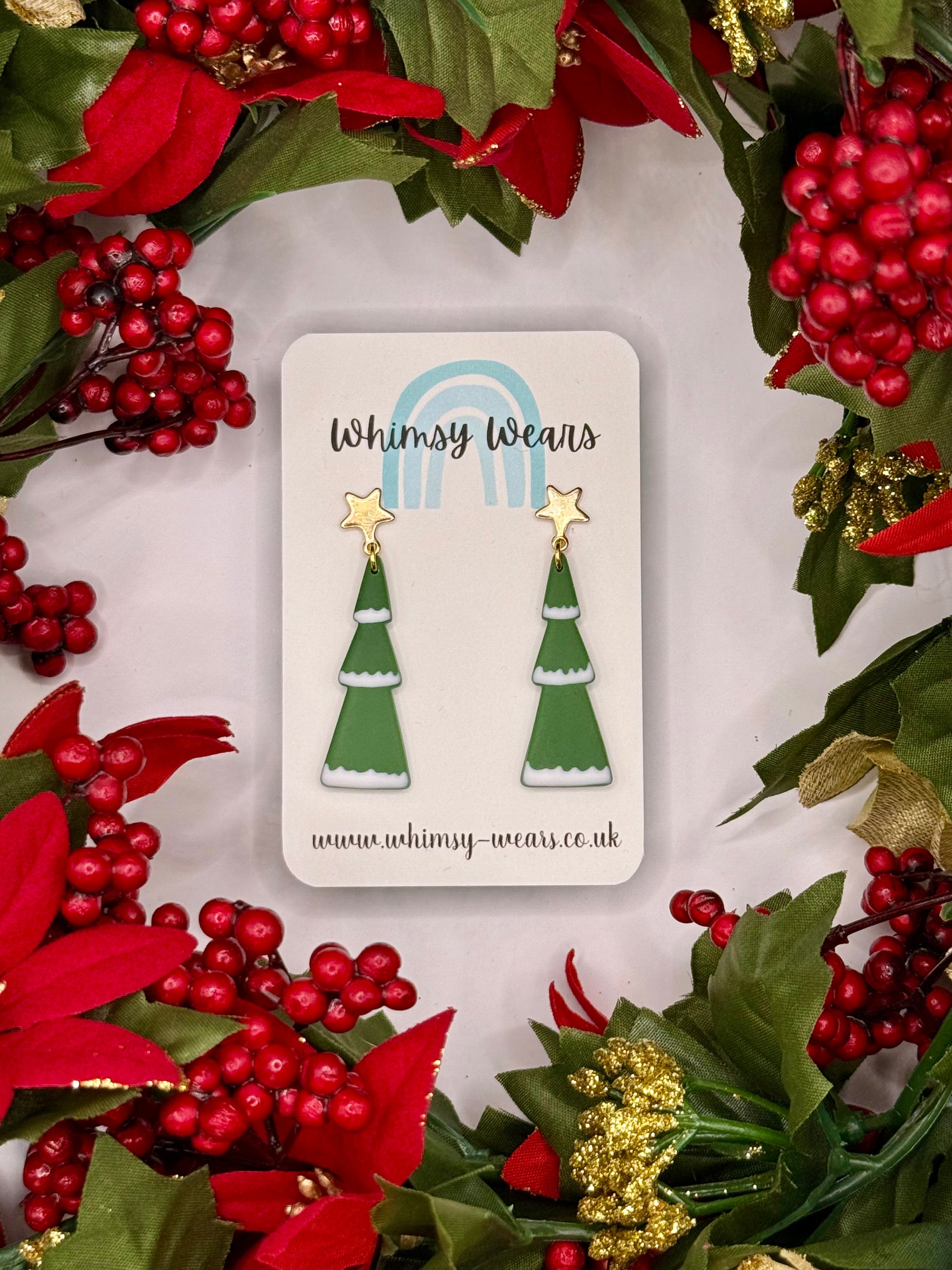 Snowy Christmas trees with either a silver or gold coloured star stud.