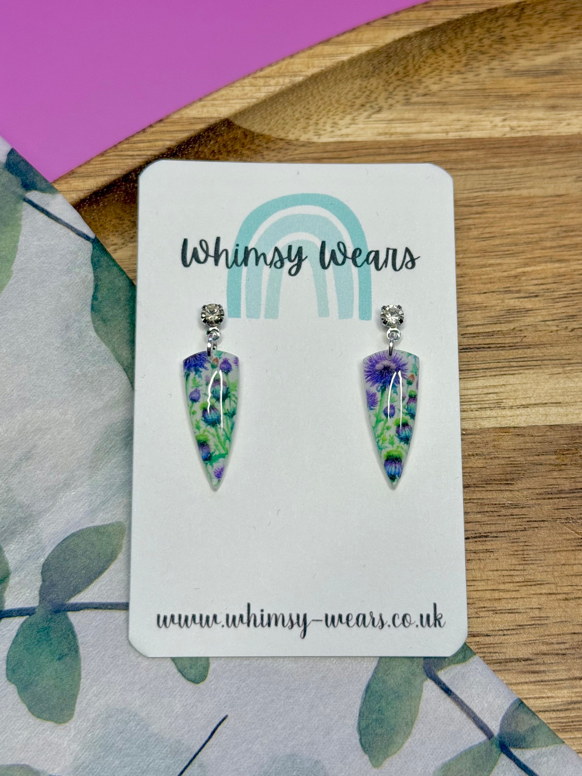Thistle patterned dagger style earrings. These earrings are handmade with polymer clay and finished off with a layer of glossy resin and a gold or silver coloured gem stud.