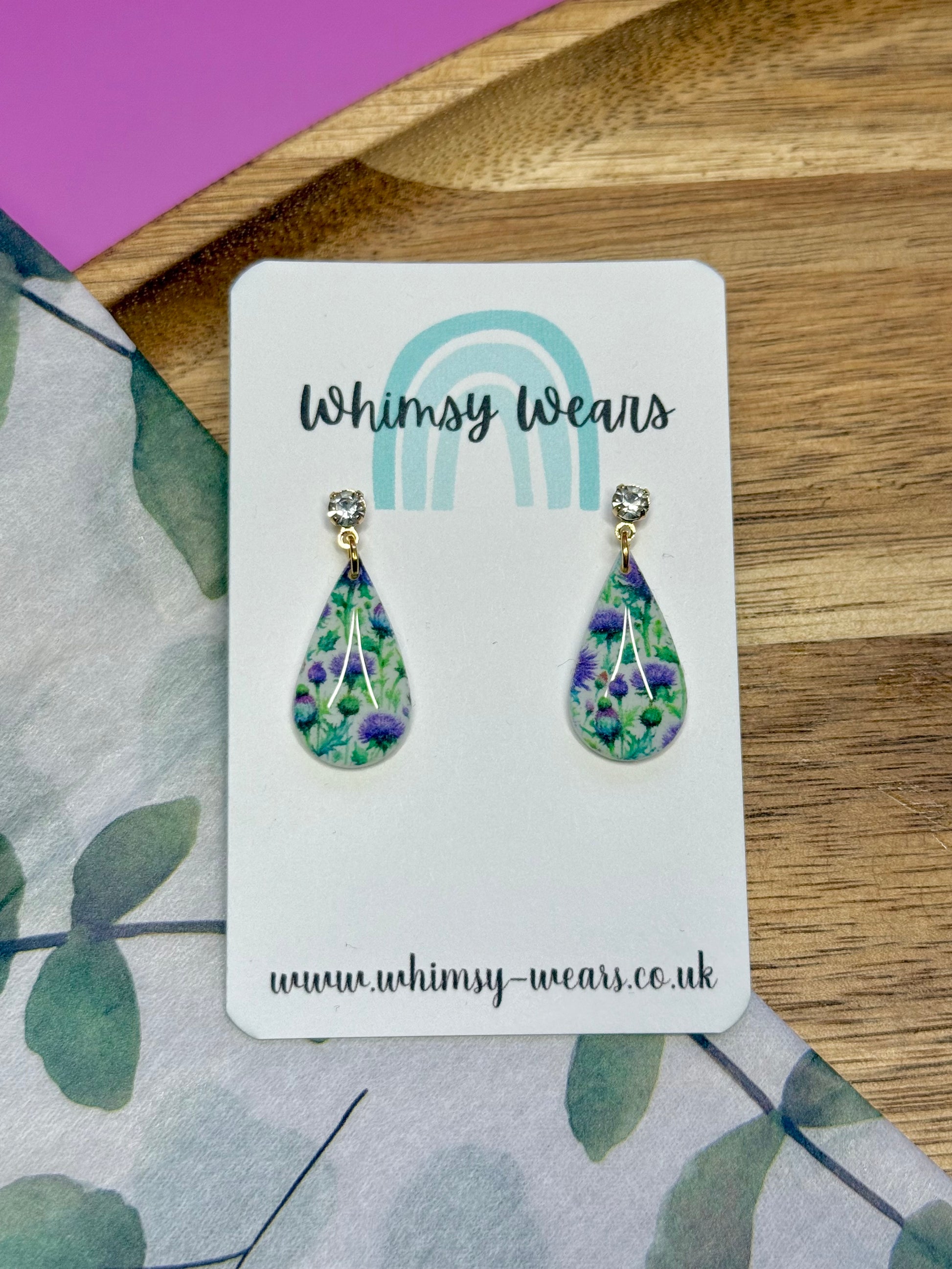 Thistle patterned droplet style earrings. These earrings are handmade with polymer clay and finished off with a layer of glossy resin and a gold or silver coloured gem stud.