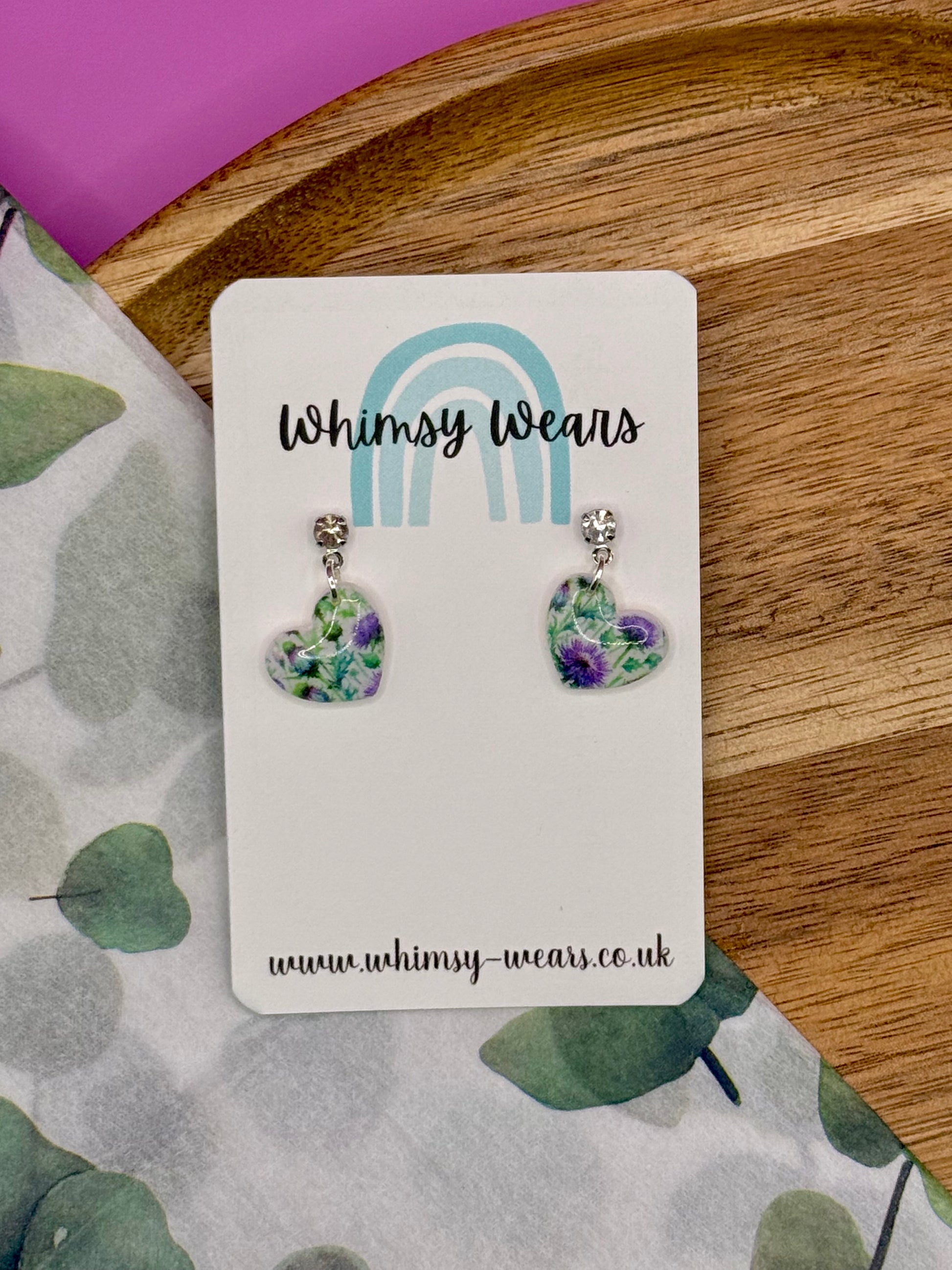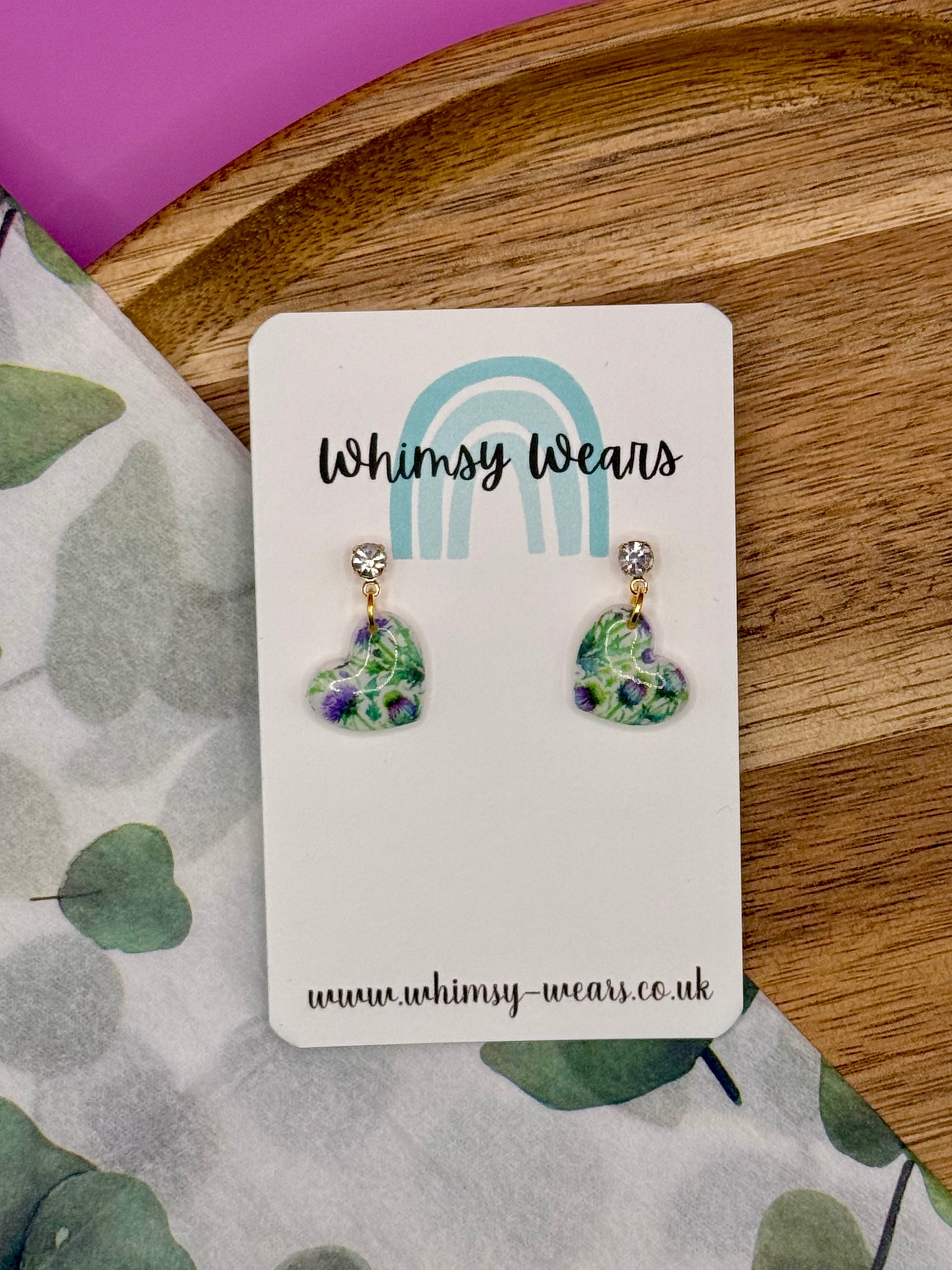 Thistle patterned and heart shaped. These earrings are handmade with polymer clay and finished off with a layer of glossy resin and a gold or silver coloured gem stud.