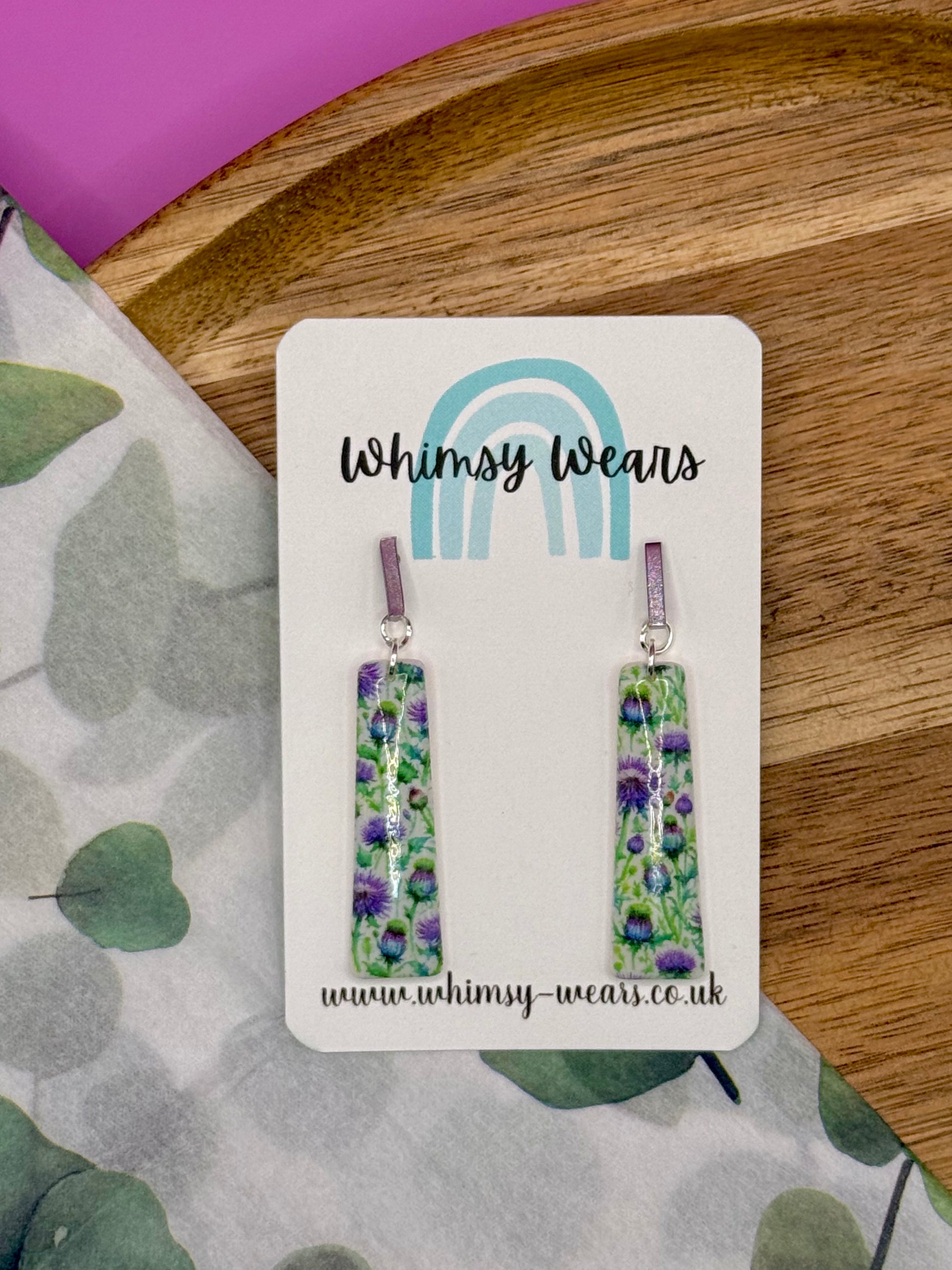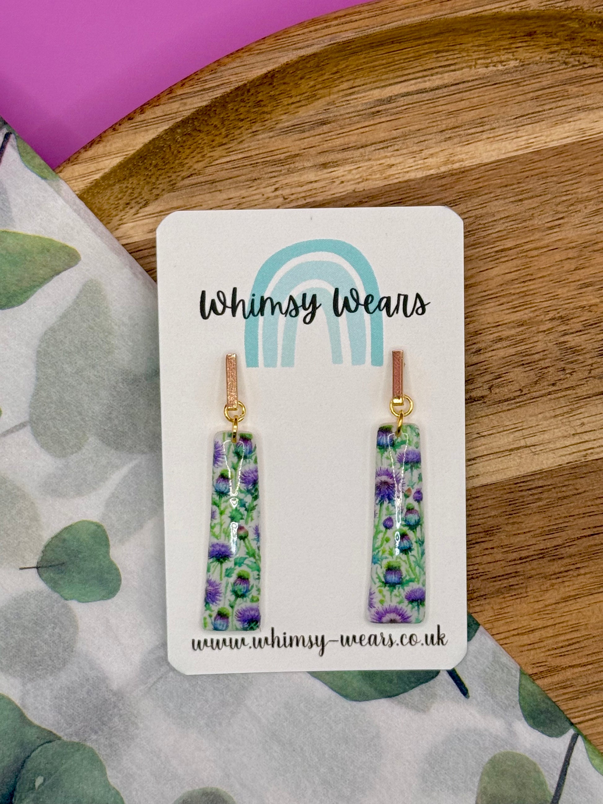 Thistle patterned rectangle earrings. These earrings are handmade with polymer clay and finished off with a layer of glossy resin and a gold or silver coloured rectangle stud.