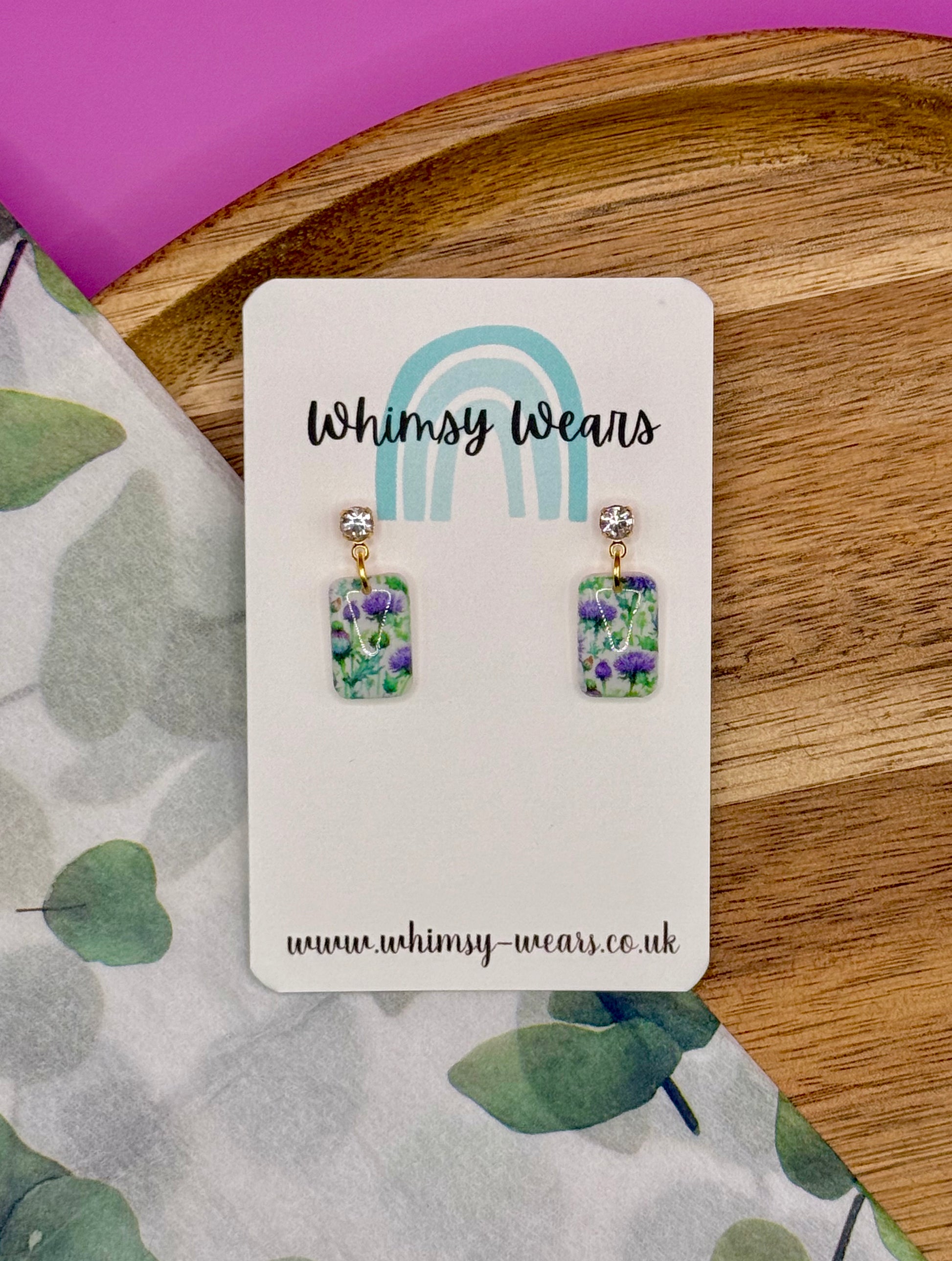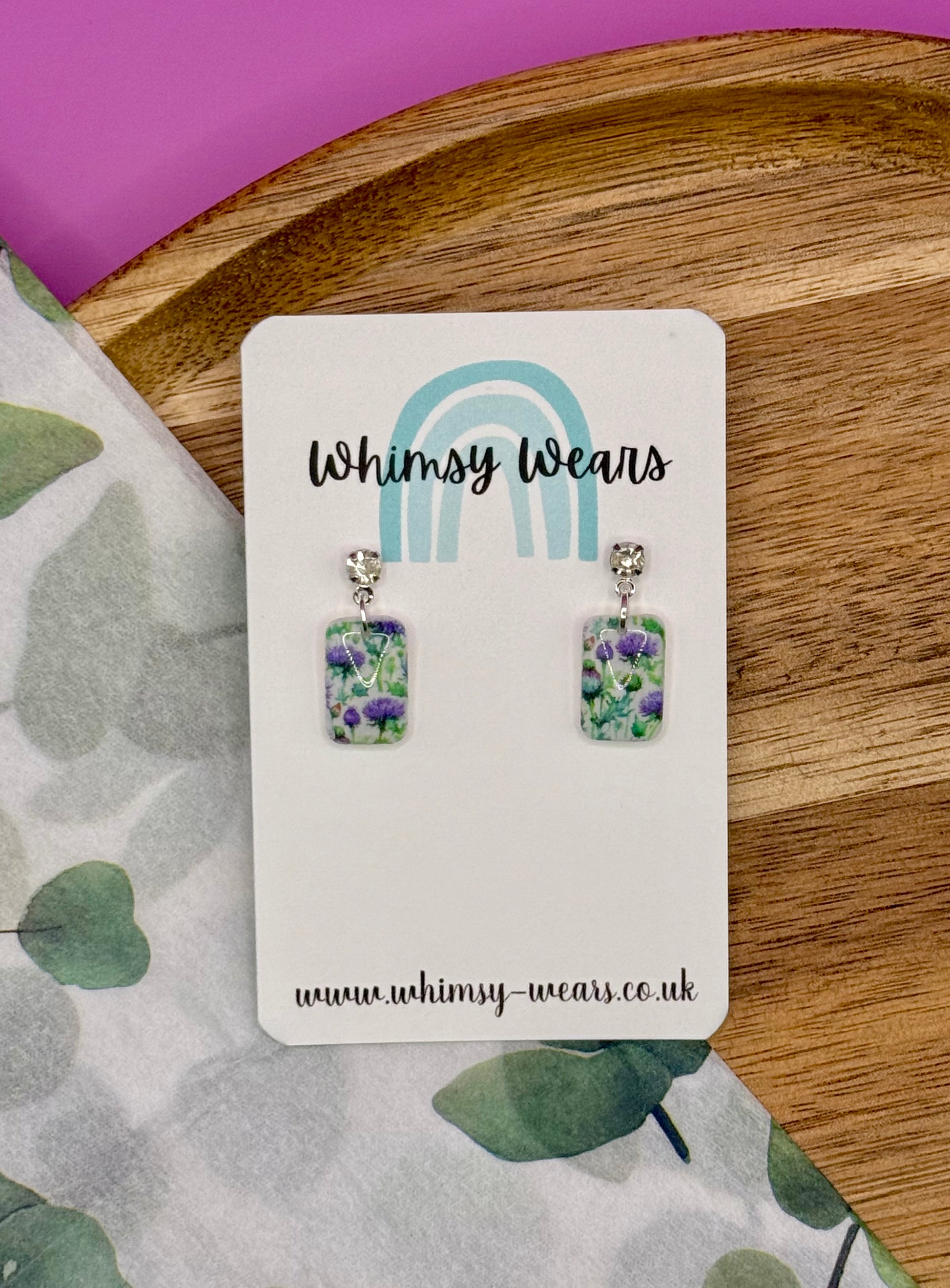 Thistle patterned and small rectangle shaped. These earrings are handmade with polymer clay and finished off with a layer of glossy resin and a gold or silver coloured gem stud.