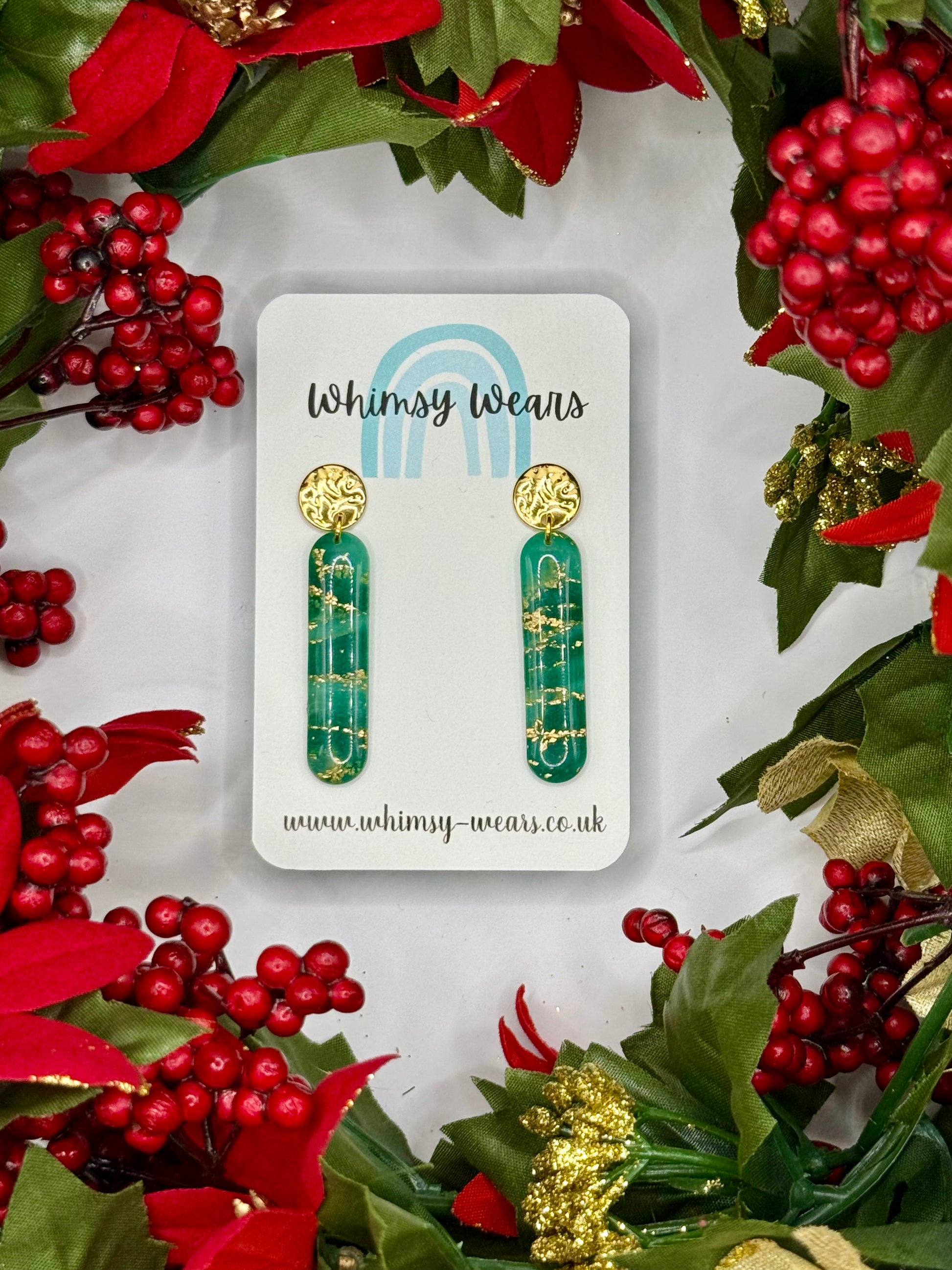 Green & Gold long oval drop earrings with gold coloured circle stud.