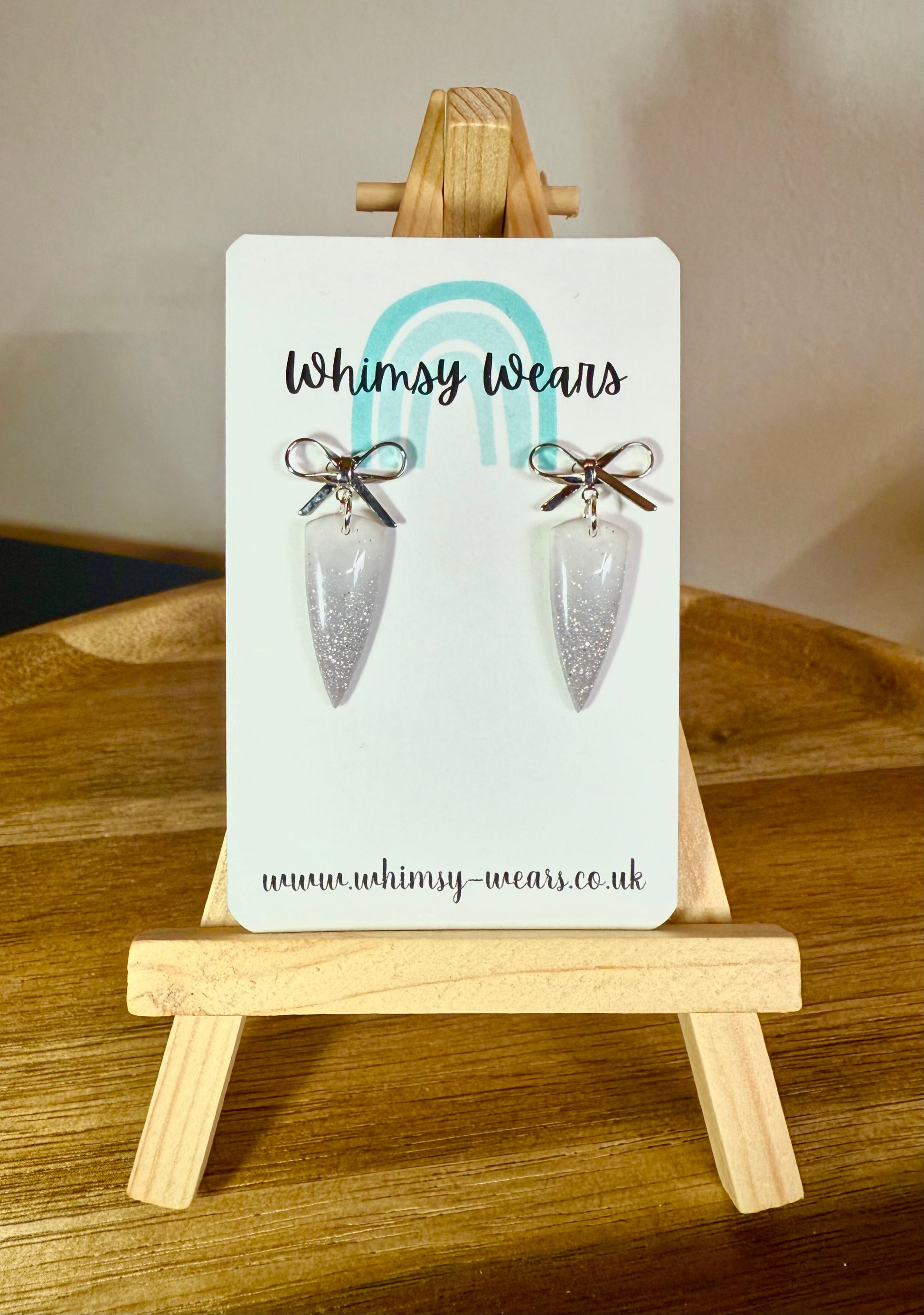 White & Silver drop earrings with a glossy resin top coat and silver coloured bow stud.